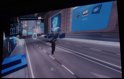 派手な演出で始まったオープニングスピーチ。3人の係員がタブレットで撮影した映像をインテルのリアルセンステクノロジーを使ってリアルタイムに加工し中央スクリーンに投影した