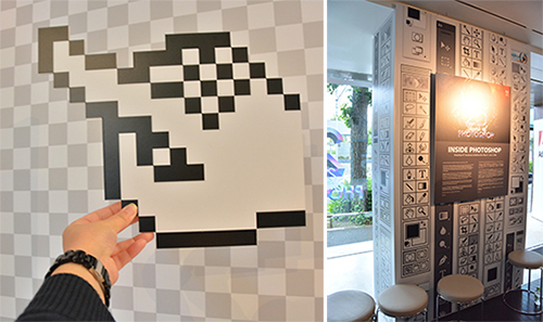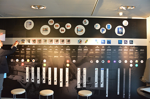 「INSIDE PHOTOSHOP」では、歴代のPhotoshopのアイコンやツールがパネルとして用意され、手に取ることができる。また、各バージョンで追加された新機能や、それとともに変化してきたツールバーを並べた年表なども展示。会場全体がPhotoshopの作業スペースのようなデザインになっており、普段からPhotoshopを使っている人なら、Photoshopの世界に入り込んでしまったような空間に仕上がっている。