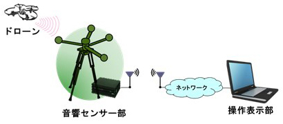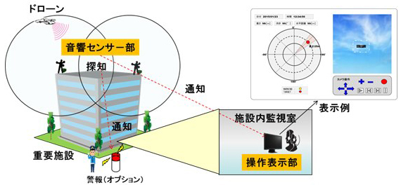 ドローンが飛行音を隠匿することができない点に着目。従来から培ってきた空中音響技術をベースにドローンの飛行音を複数のマイクロフォンで収集して音源位置分析を行い、飛来方位・仰角、距離の通知が可能な「ドローン探知システム」を開発した。音響センサ部と操作表示部で構成。探知範囲は、音響センサの設置数と配置場所によって広げることができる。ネットワークを使った遠隔監視にも対応する。