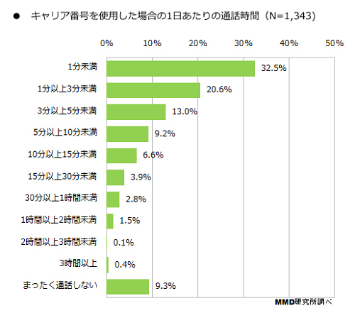 では、この1時間という時間は長いのか短いのか。MMD研究所が昨年の夏に実施したスマートフォンユーザーの通話利用に関する調査によると、1か月の通話時間が「1時間未満」というユーザーが8割以上だった。さらに、15分未満のユーザーは67.1%。15分の通話料はたった600円だ。かけ放題プランを選び、毎月2700円を支払っても8割のユーザーは元を取れていない、ということになる。