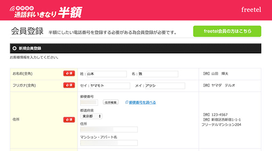音声通話ができるスマホを用意したら、さっそく「通話料いきなり半額」に登録しよう。アプリを利用するには会員登録が必要なので、まずは「通話料いきなり半額」のウェブサイトにアクセスし、氏名や住所、通話料を半額にしたい携帯電話の番号を登録する。