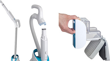 独自の「2WAY楽楽ノズル」を備え、PCや棚周り、エアコン周りや家具のすき間なども掃除がしやい(左)。ダストカップはワンタッチでふたを開けて片手でゴミ捨てが可能