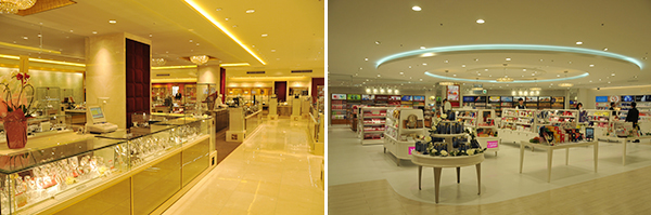 国内や海外の高級腕時計やジュエリーが並ぶ5階フロア(左)、明るいイメージが広がる6階の化粧品や日用品、ドラックのフロア(右)