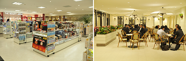 フロア構成は5階から8階までで面積は2100平方メートル。5階は時計やジュエリーなどが並ぶ落ち着いた雰囲気の高級品フロア、6階に上がると化粧品、健康食品、日用品、ドラック、土産、菓子などが並ぶ明るいイメージのフロアが広がる。