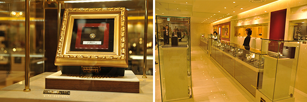 3億円の10カラットのダイヤモンド(左)、まるで高級ブティックのようなブランド・ジュエリーのコーナー(右)