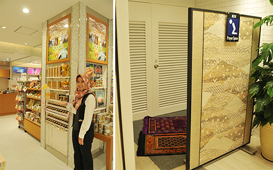 ムスリム向けの特設コーナーではウズベキスタンとインドネシア国籍の社員が対応する(左)、礼拝スペースも設置(右)