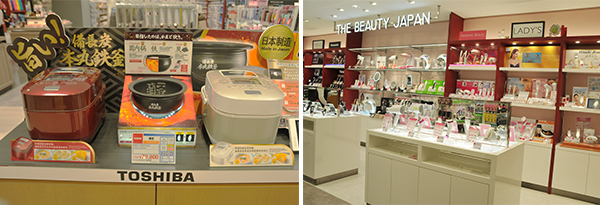 赤色や金色、10号炊きなどのオリジナルモデルの炊飯器が響く(左)、理美容家電もインバウンド需要の取り込みに欠かせないアイテム(右)