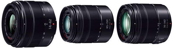 (左から)LUMIX G VARIO 14-42mm/F3.5-5.6 II ASPH./MEGA O.I.S.、LUMIX G VARIO 45-150mm/F4.0-5.6 ASPH./MEGA O.I.S.、LUMIX G VARIO 14-140mm/F3.5-F5.6 ASPH./POWER O.I.S.