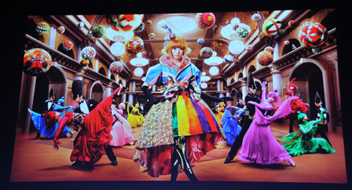 舞踏会で踊るきゃりーぱみゅぱみゅさんは、フランス国王ルイ16世の王妃、マリー・アントワネットをイメージしているが、身にまとう衣装は所々にカラフルな和のテイストがちりばめられている。高精細で色彩感豊かなAQUOS 4Kの映像美を伝える。