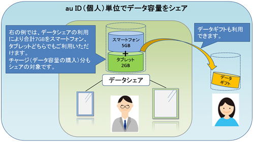 同一名義の4G LTEスマートフォン/携帯電話と4G LTEタブレット端末/PCで、データ容量をシェアできるサービス。一つのau IDに対してスマートフォン/携帯電話1台と、タブレット端末または対応PCが5台まで最大6台で利用できる。家族間でデータ容量を贈りあえる「データギフト」を組み合わせれば、個人でも家族でも使い方に合わせてムダなくデータ通信を利用できる。