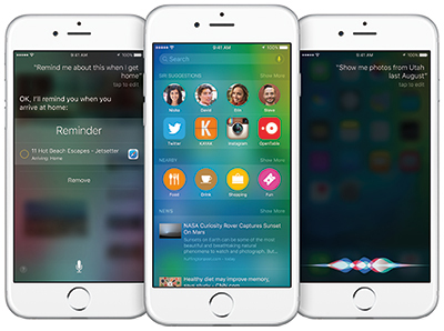 iOS 9は今秋、無料ソフトウェアアップデートとして、iPhone 4s以降、第5世代iPod touch、iPad 2以降、iPad mini以降を対象に提供。音声アシスト機能「Siri」を新設計し、文脈にそったリマインダや、写真・ビデオを検索する新しい方法を追加した。ユーザーの先を読むアシスタントとしての機能は、プライバシーを損なうことなく最も関連性の高い情報を表示。これまでの利用パターンをもとに、ユーザーが使うアプリケーションや連絡する相手を自動的に提案したり、交通状況を考慮したうえで予定に間に合うように出発すべき時間を知らせる。