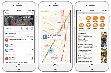 内蔵アプリケーションは、マップに主要都市の交通機関網と時刻表のサポートが加わった。地下鉄の駅の入口と出口を地図上に表示し、移動の詳細を表示。マップが電車、地下鉄、バス、徒歩を組み合わせて表示する機能や、食べ物、飲み物、ショッピングなどの情報を検索すると近くにある関連施設を表示する「Nearby機能」を備える。なお、マップの交通機関情報は、ボルチモア、ベルリン、シカゴ、ロンドン、メキシコシティ、ニューヨーク市、フィラデルフィア、サンフランシスコベイエリア、トロント、ワシントンD.C.を含む一部の主要都市、北京、成都、上海を含む300以上の中国の都市で提供する。