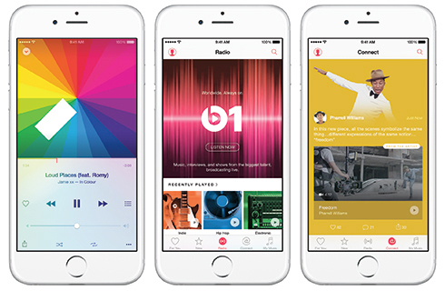 ストリーミング型音楽サービス「Apple Music」、ラジオステーション「Apple Music Radio」、アーティストとつながることができる「Apple Music Connect」を組み合わせて提供する。「Apple Music」は、iTunes Storeで購入したり、音楽CDから読み込んだ楽曲に加え、3000万曲以上で構成するApple Musicカタログから選んだりできる。