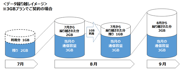 「データ繰り越し」は、当月の使い切れなかった通信容量分を翌月末を期限として繰り越すことができるサービス。別途手続きは必要ない。繰り越し最大容量は、使い切れなかった月の契約プランの通信容量分。例えば、3GBプランを契約中で、7月に1GBを利用して2GBが残った場合、残った2GBは8月に繰り越すことができる。8月は、7月の繰り越し分2GBと契約プラン3GBの合計5GBを利用することが可能。7月の繰り越し分で8月の通信量が間に合った場合、9月は、8月の契約プラン分の繰り越し3GBと9月の契約プラン分の合計6GBを利用できる。