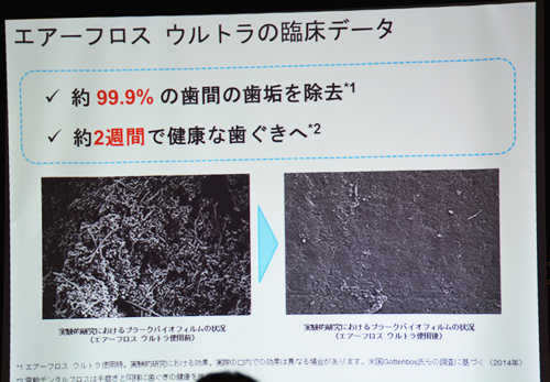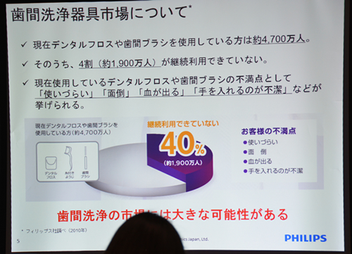 前橋マネージャーは、「デンタルフロスや歯間ブラシなど、手動の歯間洗浄器具を使用しているユーザーにアンケートを実施したところ、4割のユーザーが続かないことがわかった。続かない理由は使いづらい、血が出る、手を口の中に入れるのが不潔など。手動の歯間洗浄器具に不満や不安を抱えているユーザーが多いことがわかった」と話した。