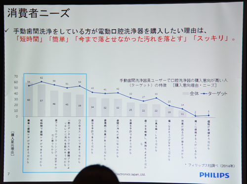 さらに、手動の歯間洗浄器具ユーザーで、電動口腔洗浄器の購入意向が高いユーザーに質問したところ「電動口腔洗浄器なら『短時間に』『簡単に』『今まで落とせなかった汚れを落とせそう』『口の中をスッキリできそう』と期待を寄せているユーザーが多かった。こういったユーザーのニーズに応えたい」と前橋マネージャーは上位モデルの「HX8332/01」を開発した経緯を説明した。