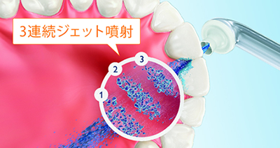 「トリプルバーストテクノロジー」は、ワンプッシュで3連続のジェット噴射を行う独自技術。加圧された空気でミクロの水滴を3連続噴射し、歯ブラシの毛先が届きにくい歯間の汚れを優しく効果的に洗浄する。また噴射回数は好みに合わせて1回、2回、3回から選択できる。