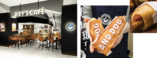 キーズカフェでは、ネルドリップで丁寧に抽出した「氷温熟成珈琲」や、ビックロだけのオリジナルメニュー「グランドッグ」が味わえる。「グランドッグ」は、ジューシーなソーセージをモチモチでやわらかいバゲットで包んだホットドッグで、新しい食感が楽しめる。