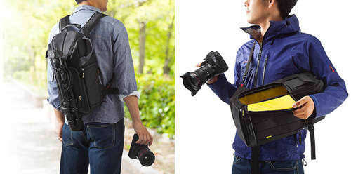 スリムでスタイリッシュな軽量タイプのカメラバッグ。ショルダーベルトが取り外せるので、長時間の撮影や移動に便利なリュックタイプと速射に対応しレンズ交換がしやすいワンショルダータイプを使い分けられる。