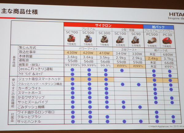 タイプ別の主な商品仕様は表のとおり。なお、紙パック式のPC500の吸込仕事率が「未定」となっているのは、9月中旬の発売に向けてチューニング中であるためだ。