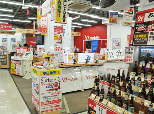 確かに売り場は、ビックカメラでよく目にする山積み展示は見受けられない。柱周りのディスプレイもすっきりとして、フロアの床と商品展示のボードはブラウンで統一してある。Surface3のコーナーでは、Surface3 Pro3との新旧比較や、ワイモバイルのLTE対応になったことで頭金ゼロ円で月賦販売ができる点などをアピールしていた。