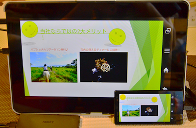 例えば、スマートフォンを利用したプレゼンだ。客先の打ち合わせでプレゼンをするような場合、PCを利用することもあるだろう。しかし、横並びに資料を覗いていてもいまいち臨場感は出ない。そこで、「On-Lap 1303I」の出番だ。「On-Lap 1303I」をスマートフォンと接続し、プレゼンアプリで資料を表示すれば、プレゼン資料の説得力もぐっとアップすることだろう。