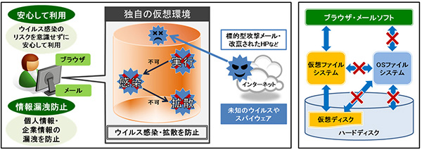 事前に設定したウェブブラウザやメールソフトの利用を、独自の仮想ファイルシステムによって既存の環境から隔離することで、不注意で不審なリンクをクリックしたり、ウイルスが埋め込まれたファイルを開いたりした場合でも、ウイルスを実行させず、ウイルスの感染を予防するソフトウェア。従来のウイルス対策ソフトでは防げなかった未知のウイルスも予防できる。