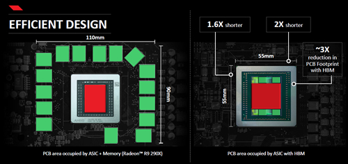 Radeon R9 Fury Xは、4Kやバーチャルリアリティー(VR)を想定した「Fiji」というアーキテクチャで構成。Fijiに使われているHBM技術は、従来のようなGPUの周りにメモリーを配列するのではなく、GPUの中にメモリーを実装する。これにより、電力消費の効率化や小型化が図れるという。