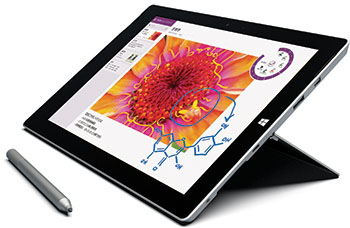 Surface 3は、10.8インチのClearType HDマルチタッチディスプレイを搭載するWindowsタブレット端末。机の上でも取り扱いしやすいサイズで、手のひらをタブレット画面に置いた状態でもペン入力が可能。紙に鉛筆で書く姿勢と同様に自然な姿勢でペンを利用することができる。WindowsのデスクトップアプリとWindows ストアで提供するデジタル教科書・教材をはじめとしたアプリが利用できる。