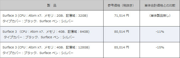 文教市場向けSurface 3バンドルモデルの製品構成と価格