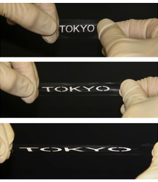 プリントできる伸縮性導体。上段は元の長さ、中段が約2倍、下段が3倍強に伸ばした状態。導電性は維持されている