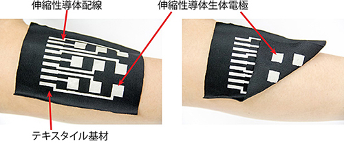 この導電性インクを使って、通常の半導体プロセス技術では形成することが難しい繊維素材の上に伸縮性の配線や電極をプリント。テキスタイル型の筋電センサを実現した。テキスタイル型の生体情報センサをプリントするだけで簡単に作製できるようになり、スポーツ、ヘルスケア、医療でさまざまな応用が期待される。