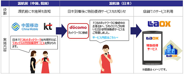 提携の最初の取り組みとして、日本滞在時にドコモのネットワークを通じて国際ローミングを利用する中国のチャイナモバイル、韓国のKTユーザーを対象に、ラオックスでの買い物に利用できる特別優待サービスを10月から提供する。対象のユーザーが日本の空港などで国際ローミングを利用する際に、ドコモのネットワークに接続すると特別優待サービスに関する情報を通知する。日本にあるラオックス全店で商品購入時に割引サービスを受けることができる。