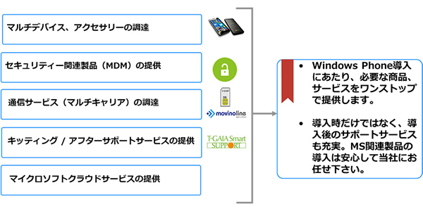 Windows Phoneを導入するために必要な通信サービス、マイクロソフトの「Office 365」「Intune」などのクラウドサービス、導入時のキッティングサービスやアフターサポートサービスをティーガイアがワンストップで提供。導入後のアフターサービスも用意する。通信サービスは、NTTドコモや各MVNO事業者の音声付きSIMに加え、ティーガイアの法人顧客向け通信回線管理サービス「movino star」などのソリューションサービースを提供する。通信料金の一括請求代行や通信プランの最適化のコンサルティングサービスも合わせて提案する。