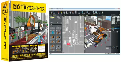 メガソフトは、バリケードや現場作業員などの工事用素材を3D画面に配置して施工計画書の挿絵を作成したり、重機の動作を設定して作業域を視覚的に確認したりできる、Windows用工事イラスト作成ツール「3D工事イラストワークス」を7月16日に発売する。税込価格は、パッケージ版が6万4800円、ダウンロード版が5万9400円。