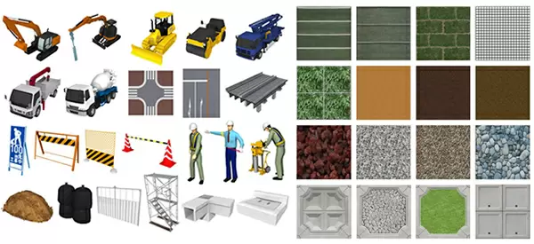 収録素材をマウスで3D画面に並べていくだけで、工事現場の作業イメージを作成できる。建設機械のバックホーや保安用品など3D素材約1100点、地面、方面用テクスチャ素材約1200点を収録するとともに、地形作成機能で幅広い現場イメージに対応した地形をつくることができる。