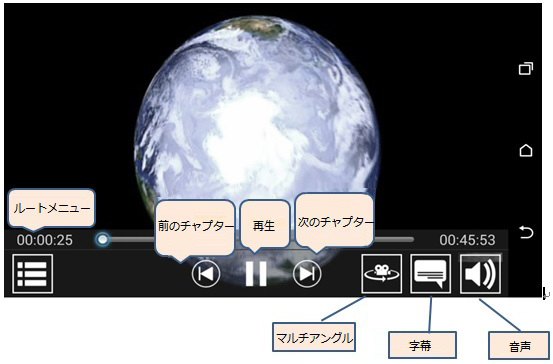 通常のDVDプレーヤーでの視聴と同様に、メニュー画面の表示や操作、字幕・音声切換、マルチアングル、レジューム再生、DVD再生中のシーク、チャプターのスキップ/バックができる。また、タッチ操作に適したシンプルなインターフェースを採用する。