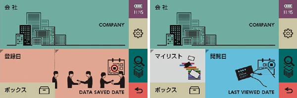 検索方法は、従来の「会社名順」「氏名順」「閲覧日順」「登録日順」「マイリスト順」「キーワード順」」に、新たに「会った日順」を追加。面会した相手のデータをタッチして、「会った日」を登録すれば面会頻度の高い相手の名刺を優先して表示できる。ホーム画面には、「設定」「会社」「キーワード」検索のショートカットを配置するほか、使用頻度の高い検索方法を二つまで選択して配置することができる。