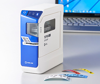 「テプラ」シリーズで初めてBluetooth接続に対応。BluetoothでiOS端末と接続し、iOSアプリ「TEPRA LINK」で作成したラベルを簡単に印刷することができる。また、PC接続専用機で初めて電池駆動に対応し、電源のない場所でも使用することが可能。