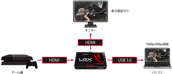 USB 3.0の高速データ転送によって、1080p/60fpsの超高画質でPS4、Xbox Oneなどの次世代ゲーム機のプレイ動画を録画できるキャプチャデバイス。HDMIパススルー機能を搭載し、大画面ディスプレイに遅延ゼロでゲーム動画を表示することができる。また、MIC/AUX入力経由でマイクからの実況音声や音楽データなどをミキサーなしで、ゲームの音声とミックスが可能。