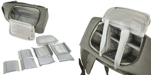 内部の仕切りが取り外せて、内部スペースをカメラやレンズなどのサイズに合わせて自由に調整できる。