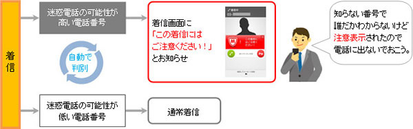 迷惑な電話や詐欺などの危険な電話の可能性が高い電話番号からの着信を自動で判別。警告画面を表示する