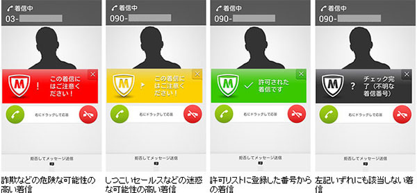 McAfee,Inc.の検知技術、トビラシステムズが提供するデータベースを活用し、不審な電話番号からの着信を自動で判別し、画面に表示するサービス。これまで無料お試し版を提供してきたが、今後は正式版を有料で提供する。