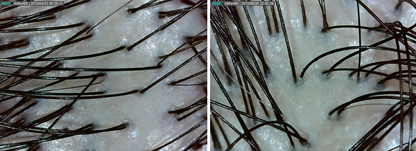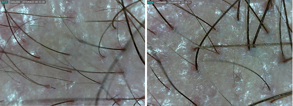 さて、論より証拠。2か月にわたり、スカルプドライヤーを実際に使用した結果を検証してみた。まずは、スカルプドライヤーを試す前後で、頭皮をマイクロスコープで撮影した画像を比較してみよう。