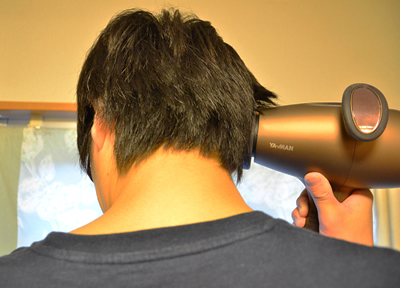 スカルプドライヤーの第一のポイントは、髪を乾かす際のダメージがほぼゼロであることだ。一般的なドライヤーは、90℃を超える熱風で髪の毛を乾かす。このとき、熱によって生じた毛髪や毛根へのダメージは、髪を傷めたり、毛が抜けたりする原因になる。一方、スカルプドライヤーの「ドライモード」の温風は約60℃。頭から10cmくらいの至近距離から当てても、あまり熱いとは感じず、髪や頭皮を熱で傷めることはない。風の温度が低いと、髪を乾かす時間が余計にかかるのではないかと不安に思う人も多いだろう。しかし、そんな心配は不要だ。なぜなら、スカルプドライヤーは遠赤外線機能を搭載しているからだ。遠赤外線には、髪の毛を内側から温める効果があるので、短い時間で髪の毛を乾かせる。髪をいたわりながらも、手早く乾かすことができるのはスカルプドライヤーの大きなメリットだ。実際に、他のドライヤーと使い比べてみても、髪を乾かす時間はほとんど変わらなかった。