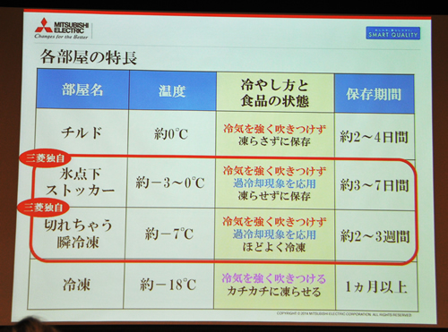 まとめ買いや調理の時短ニーズでは、昨年から搭載している「氷点下ストッカー」がユーザーから好評だという。従来の冷凍やチルド、三菱独自のマイナス7℃で保存する「切れちゃう瞬冷凍」に、もうひとつ、マイナス3~0℃の温度帯で保存する専用ルーム「氷点下ストッカー」を設けた。これにより、チルドで約4日しか保存できなかった肉や魚などの生鮮食品を、約1週間まで保存できるようにした。週末に1週間分の食材をまとめて購入する共働き世帯のニーズに応える機能だ。