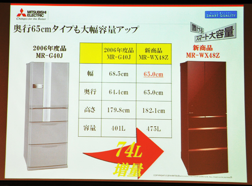 大容量化にも工夫を施した。容量475LのMR-WX48Zで幅と奥行きの両方で65センチのスリムサイズを実現。買い替えにあたる10年前の冷蔵庫の奥行きで65センチ未満が多かったことに加え、システムキッチンの奥行き65センチとぴったり合うサイズを狙っている。それでいて、10年前のモデルよりも容量を74L大きくした。