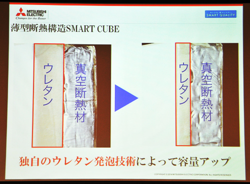 コンパクトサイズでありながらも容量アップができたのは、冷蔵庫の本体を囲んでいる断熱構造を薄くしたからだ。真空断熱材に貼り合わせているウレタン部分を、独自の発泡技術で薄くさせているのだ。同社ではこれを「薄型断熱構造 SMART CUBE」と呼んでいる。