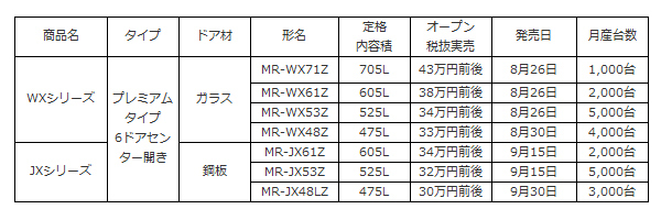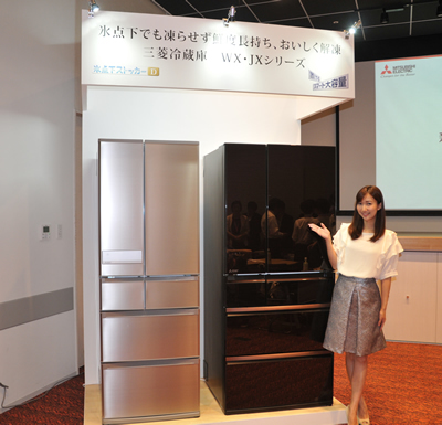 三菱電機は7月14日、マイナス3℃の氷点下でも凍らない「氷点下ストッカー」に新しい解凍機能を搭載した冷蔵庫「置けるスマート大容量」WX・JXシリーズなど7機種を、8月26日から順次発売すると発表した。容量705Lの代表モデル「MR-WX71Z」の価格はオープンで、税別実勢価格は43万円前後の見込み。