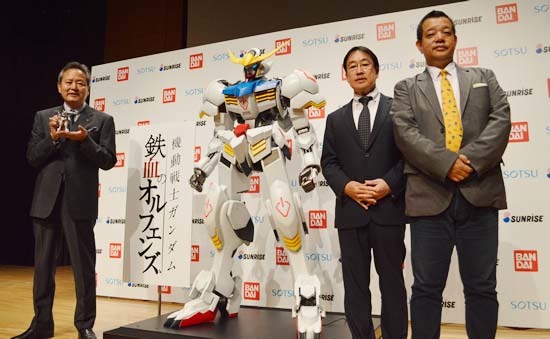 旧作の世界観を引き継ぎ往年のファンを意識した作品が多かったが、新作「鉄血のオルフェンズ」は、ストーリーをはじめ、多くの要素で新しさを意識。上野社長は「新世代のガンダムとしてふわさわしい作品に仕上がった。ドラマ性の強い物語や主人公とともに変革を遂げるガンダムなど、見どころは多い」と、ファンに魅力をアピールした。